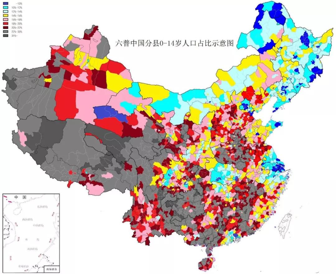第六次人口普查中国分县0-14岁人口占比示意图