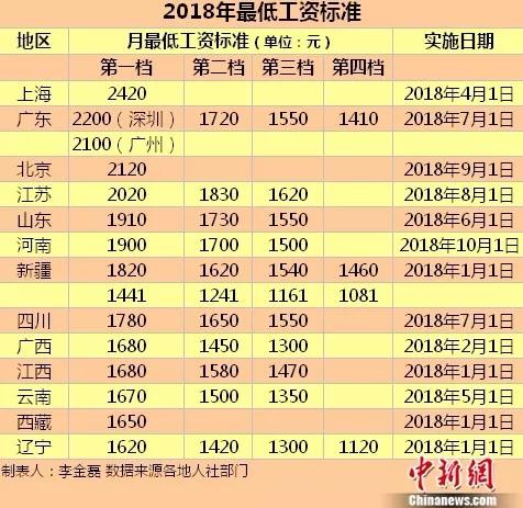 今年以来提高最低工资标准的地区至少有上海、广东、北京、江苏、山东、河南、新疆、四川、江西、广西、云南、西藏、辽宁等13个省份。