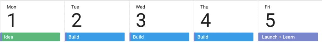 谷歌冲刺计划5天为一周期。周一,你需要进行头脑风暴,选择一个自己想要投入的领域。周二,你需要草拟出可能的解决方案。周三,基于假设进行测试。接着,周四,你需要创建一个模型,并在周五面向用户展开测试。