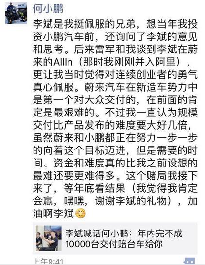 7月31日,小鹏汽车董事长何小鹏发了一条朋友圈说,今年新造车公司没有人可以交付10000台。8月5日,在蔚来深圳NioHouse开业日中,蔚来董事长李斌表示愿意和何小鹏打个赌,如果今年蔚来交不到1万台车,会赔给何小鹏一台ES8。8月6日,何小鹏隔空喊话愿接下赌局,并觉得自己肯定会赢。