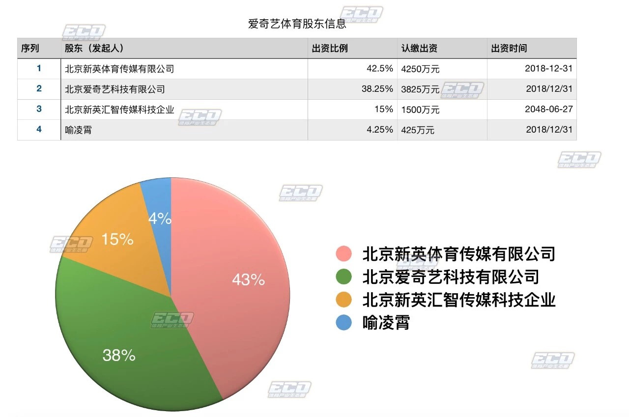 股东信息显示,合资公司中,北京新英体育传媒有限公司出资比例为42.50%,北京爱奇艺科技有限公司出资比例38.25%,北京新英汇智传媒科技企业(有限合伙)出资15.00%,喻凌霄出资4.25%。