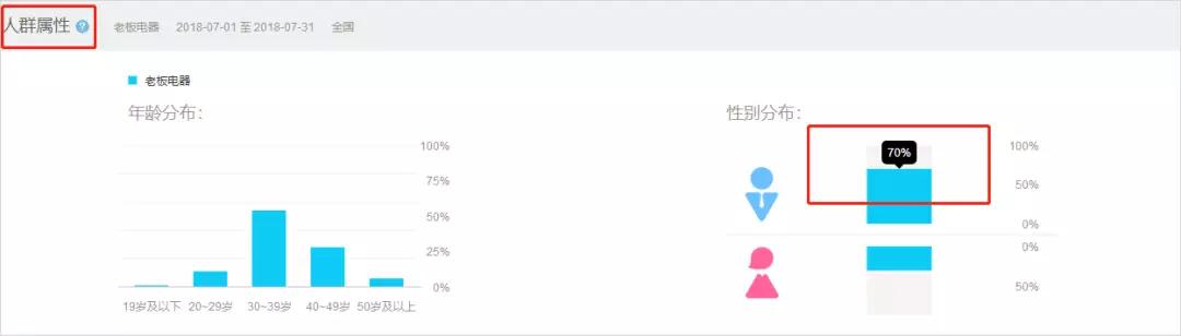 但根据百度指数显示:老板电器的用户画像中,男性用户竟占到了 70%,远远超过女性用户。