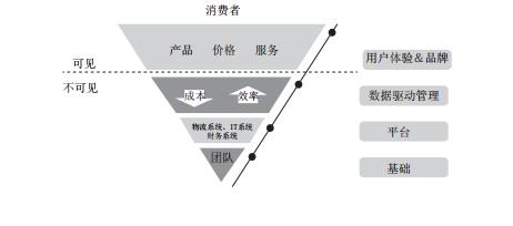 在成本、效率之上,我们还有产品、价格和服务。消费者不关注什么系统、成本和效率,他要的是正品行货、价格便宜、服务要好,我们把它定义为客户体验层。所有倒三角形战略模型最后支撑的都是客户。客户在我们内部并不是狭义的定义为网上的消费者,供应商和卖家也是我们的客户。整个倒三角的体系支撑了三类客户共同的发展。