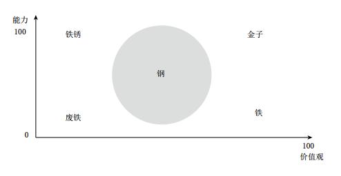 最优秀的就是公司的高管,能力跟价值观都是最好的,是占20%的“金子”,就是公司的主干力量。还有一部分人是“铁锈”,能力非常强,做产销业绩可以让利润暴涨,就是价值观跟你不一样,做事情没什么诚信,也没有合作、合办、共赢的理念,能压到哪儿就使劲切,利润做得很好,效益涨得高高的,但把供货商压榨得不行了,这样的人不能要。因为这种人给你带来业绩的同时,还给你的团队带来很大的破坏,因为他价值观跟你不一样,他能力很强,所以他搞破坏的时候比“铁”搞破坏、杀伤力要大得多。所以发现铁锈要坚决地、毫不犹豫地把它干掉,否则的话会一点一点把“钢”给腐蚀了。