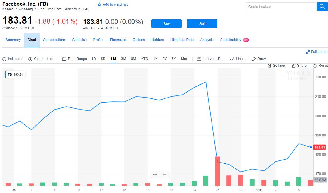 周二当天,Facebook股价高开低走,盘中一度跌破184.40美元,日内跌约0.7%,最终收跌1.01%,收报183.81美元。