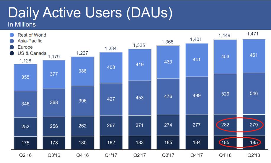 上月25日公布的财报显示,今年第二季度Facebook的营收和净利基本符合预期,但核心用户指标明显不佳,日活用户环比增速创最低纪录、北美活跃用户增长停滞、欧洲日活用户出现2014年初以来首次负增长。
