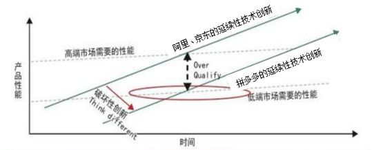 这样做虽然满足了高端市场需要的性能,但忽略了低端市场的需求。而拼多多满足的正是这一部分没有被满足的市场需求。