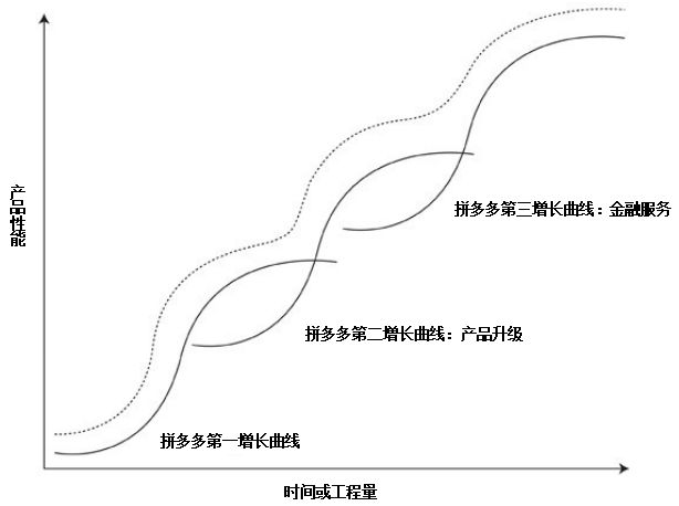 拼多多未来的发展方向包括产品升级和金融服务。而这可以为拼多多提供第二增长曲线和第三增长曲线。正如下图所示: