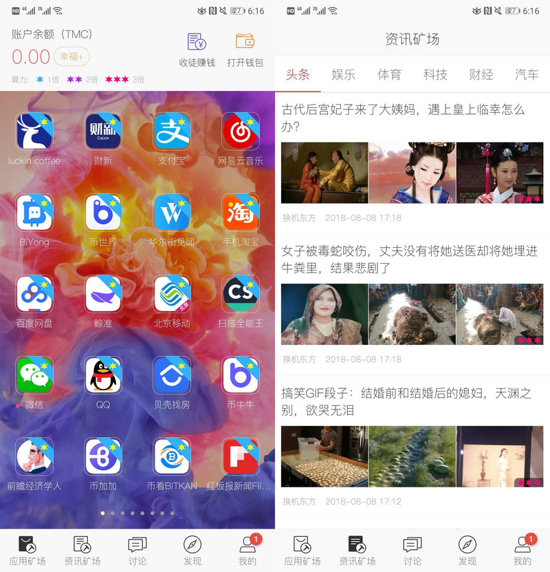 (时间链中有应用矿场和资讯矿场两个挖矿应用。应用矿场中,每个 APP 右上角的星星代表算力倍数, 使用时长相同的情况下,使用多倍算力的应用将获得更多 TMC 收益。)