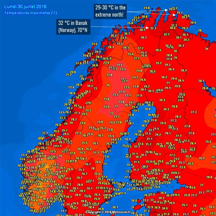 7 月 31 日,severe-weather(严重天气) 网站发现,位于北极圈内的挪威最北端 Banak 录得罕见高温 32°C——这个地方以往的夏季平均温度只有 8°C 至 12°C。