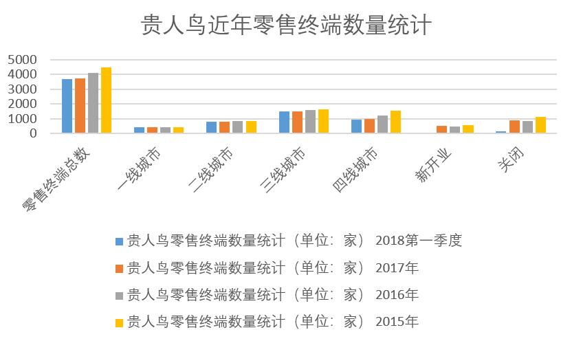 从城市分级划分来看,一线城市零售终端426家,二线城市零售终端806家,三线城市零售终端1488家,四线城市零售终端955家,三四线城市仍然是贵人鸟的主战场——而这个战场也在面临着不断萎缩。
