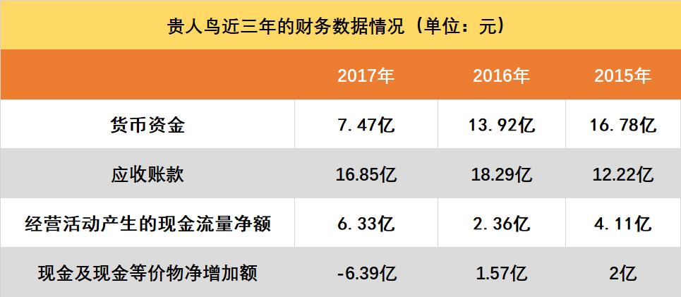 根据贵人鸟近三年的财报数字,从2015年至2017年,公司货币资金分别为16.78亿元、13.92亿元、7.47亿元;应收账款依次为12.22亿元、18.29亿元、16.85亿元;经营活动产生的现金流量金额为4.11亿元、1.57亿元、6.33亿元;现金及现金等价物净增加额2015-2016年跌幅不大,从2亿元降到1.57亿元,然而2017年,这一数据变成-6.39亿元。