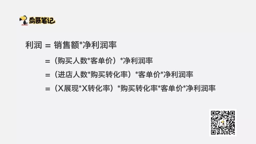 那是不是关于利润,我们运营最核心的目标应该就是:思考如何提升转化率。因为X展现、购买转化率、客单价可通过渠道、初期运营情况或行业经验有一定的预估,所以我们可以把精力重点放在提高转化率上。