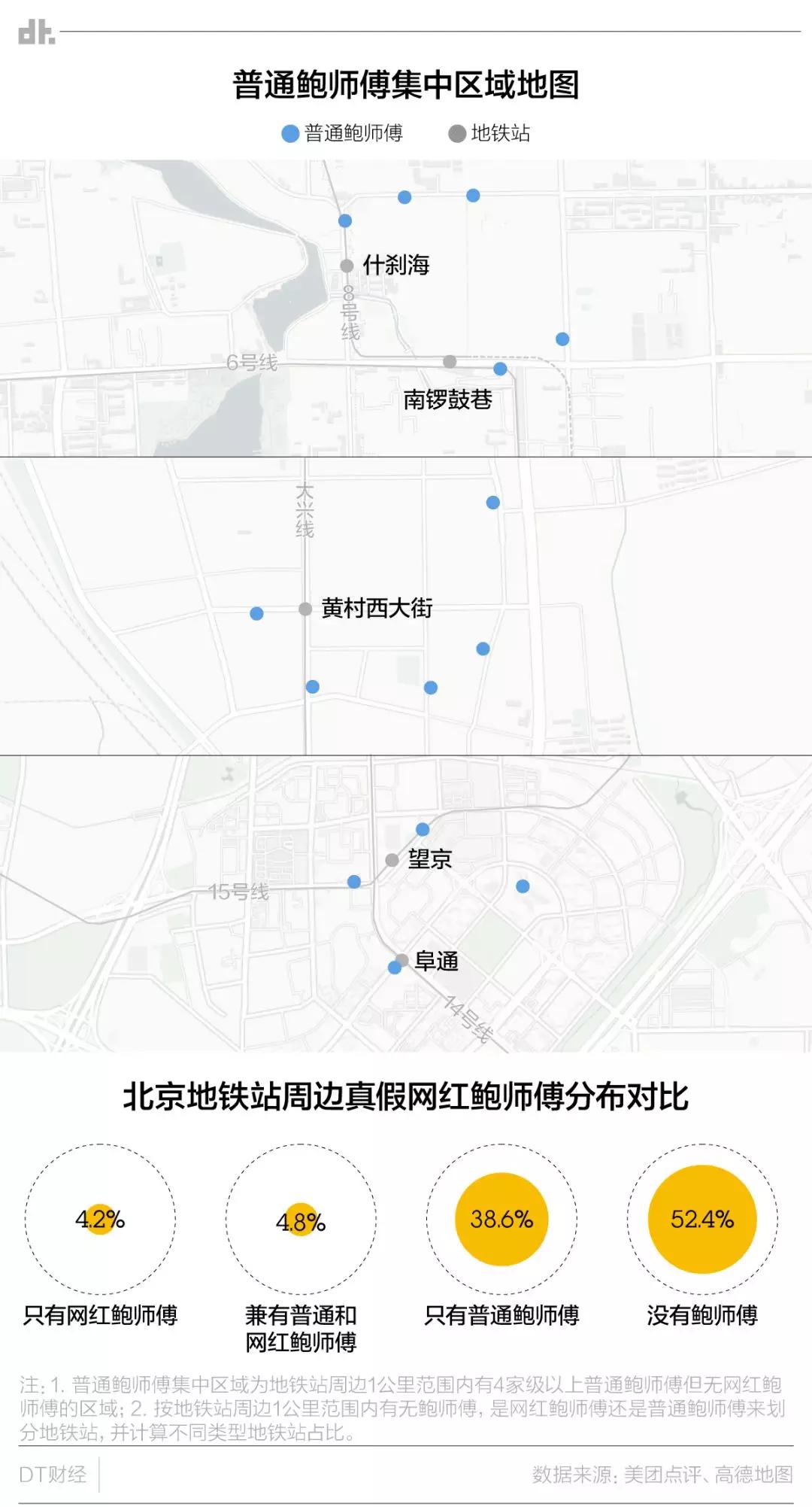凭借数量优势,普通鲍师傅们遍布全城,在五环内成片出现,只有玉渊潭和丽泽商务区附近相对空白;五环外则沿地铁线路分布。在数量上的压倒性优势造成了一种以假乱真的效果,天真如DT君,就一直被蒙在了鼓里。