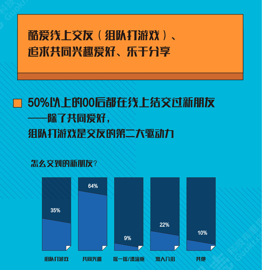 00后将兴趣作为自己的标签,找寻和自己同处一个圈子的朋友。超过一半的00后在线上认识新朋友,除了共同爱好,组队打游戏也是交朋友的第二大驱动力。