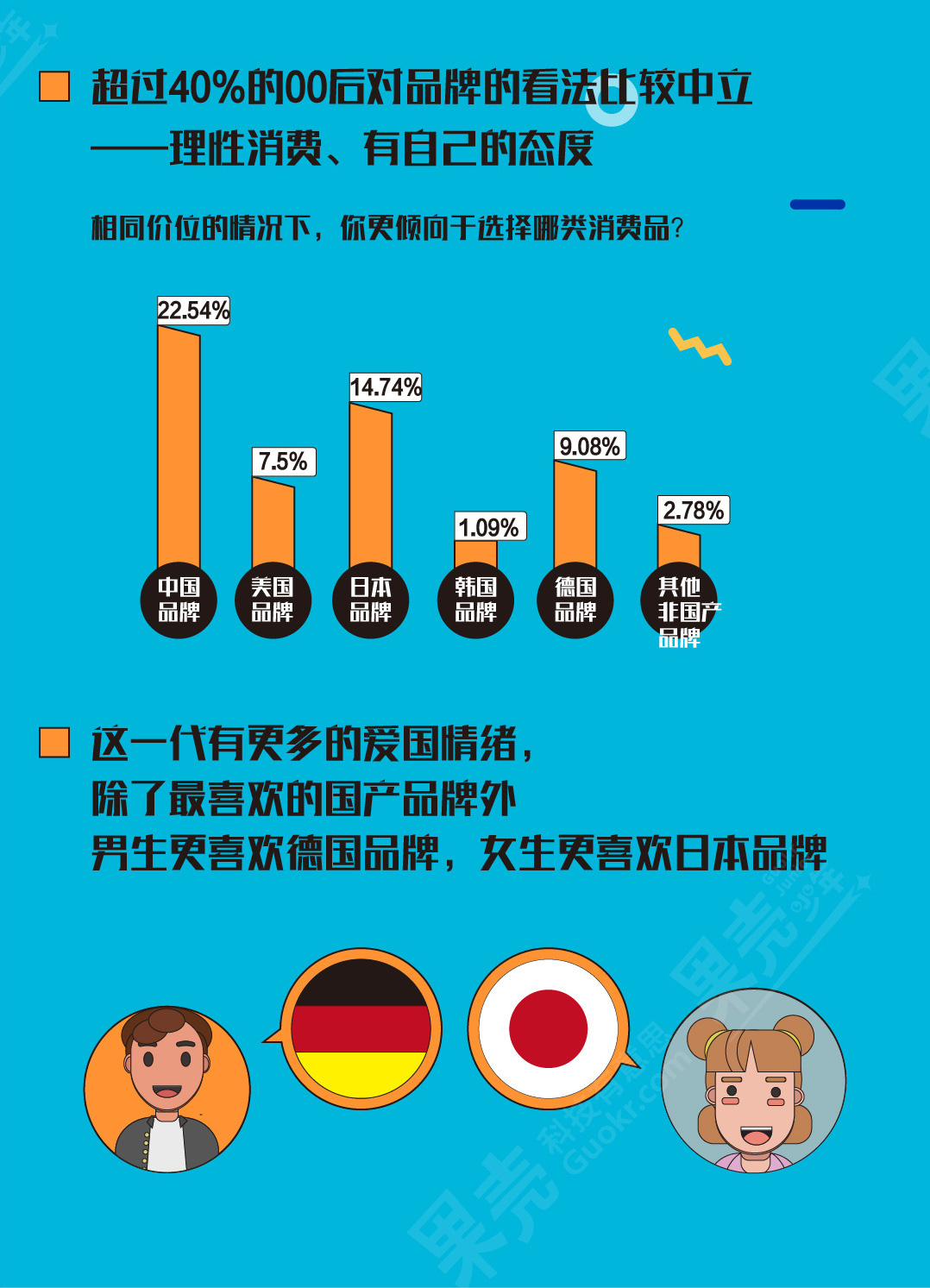 在消费过程中,超过40%的00后持有理性消费观,拥有自己的态度。他们不看重品牌产地,国外品牌不再是加分项,产品本身更为重要。在相同价位的情况下,00后倾向于选择中国品牌。除此之外,男生更喜欢德国品牌,女生偏爱日本品牌。