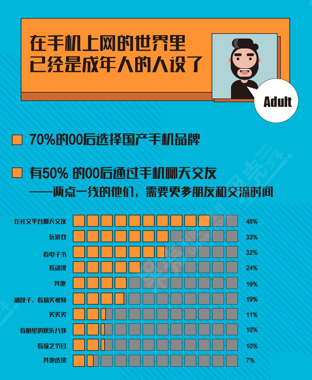 手机的使用已经在00后群体中大量普及。其中70%的00后偏爱国产手机品牌,并且对于市面上的各类产品了如指掌。将近一半的00后在使用手机时,最多的用途为社交聊天,乐于与他人沟通、分享。
