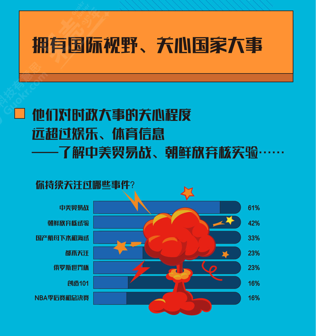 相比热搜榜单上的“俄罗斯世界杯”、《创造101》,00后对“中美贸 易战,朝 鲜放弃核试验”等新闻更为关注。拥有国际视野的他们,对时政、军事的最新动态也十分敏锐,远高于娱乐、体育。