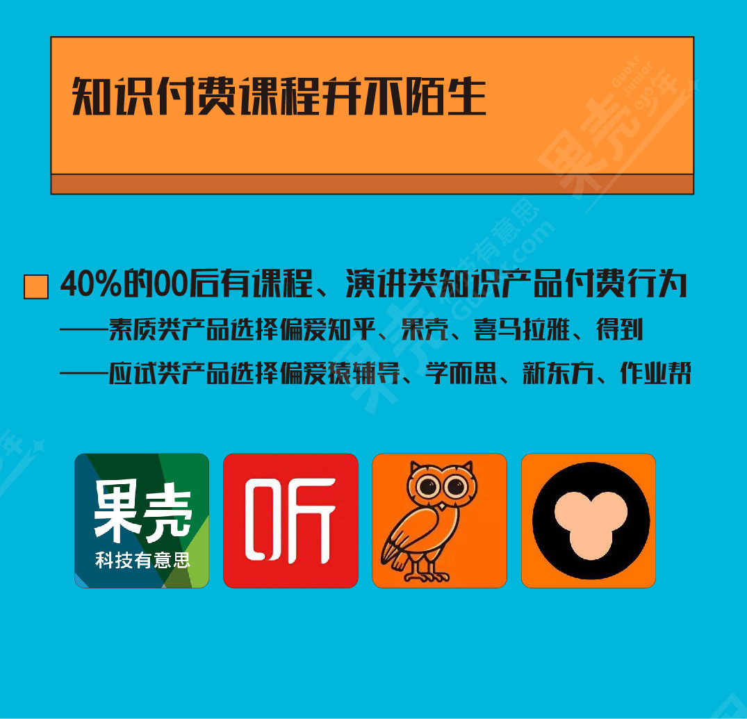 知识付费已步入00后的世界。接近一半的00后购买过课程、演讲类知识产品。从兴趣出发,他们在知乎、果壳、得到等平台找寻适合自己的内容。在学业方向上,猿辅导、学而思、新东方、作业帮深受他们的喜爱。