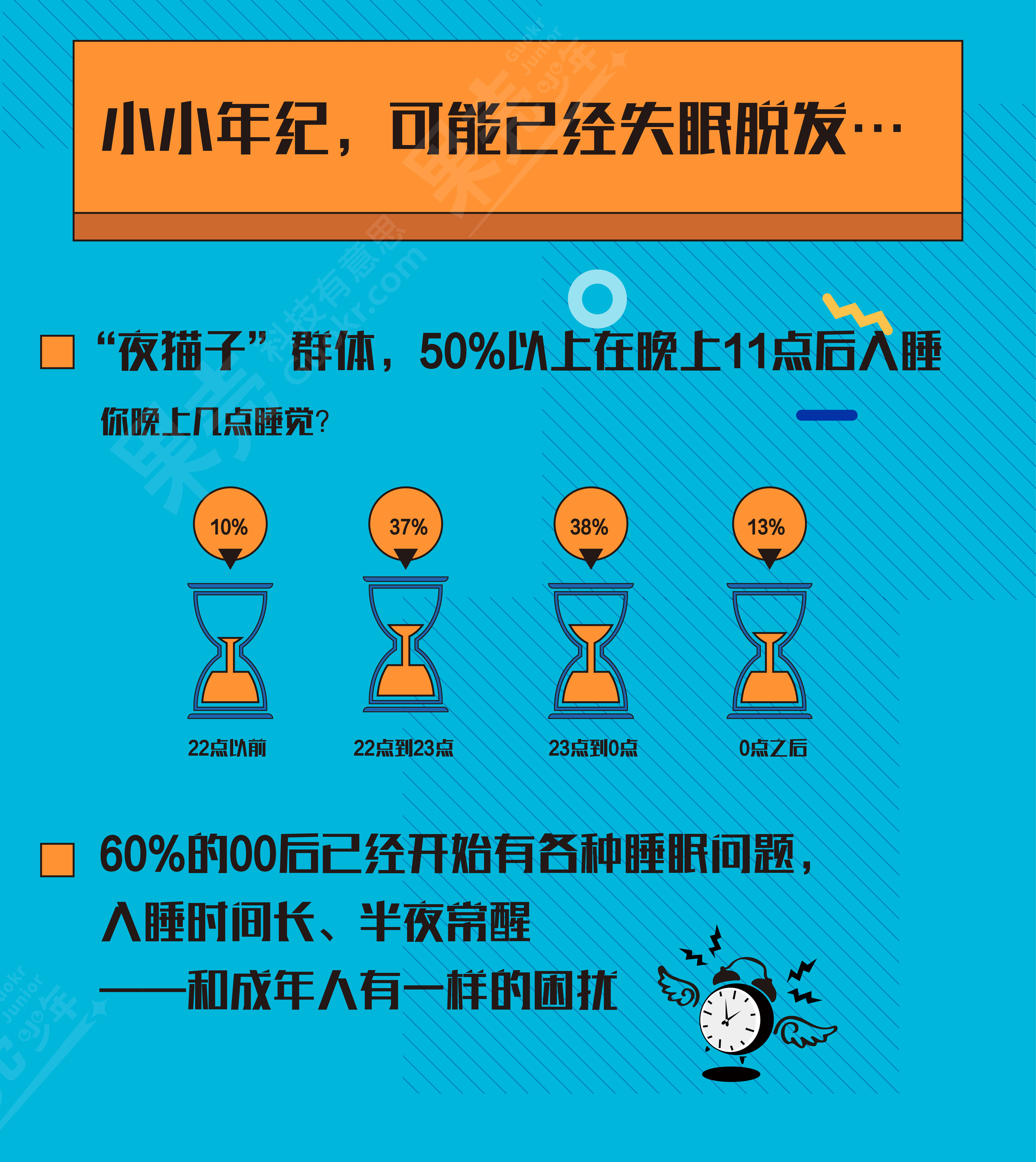 00后也是夜猫子群体,一半以上的00后在晚上11点后入睡,超过60%的00后已经开始有各种睡眠问题,例如入睡时间长、半夜常醒,这已经和部分成年人拥有一样的困扰。