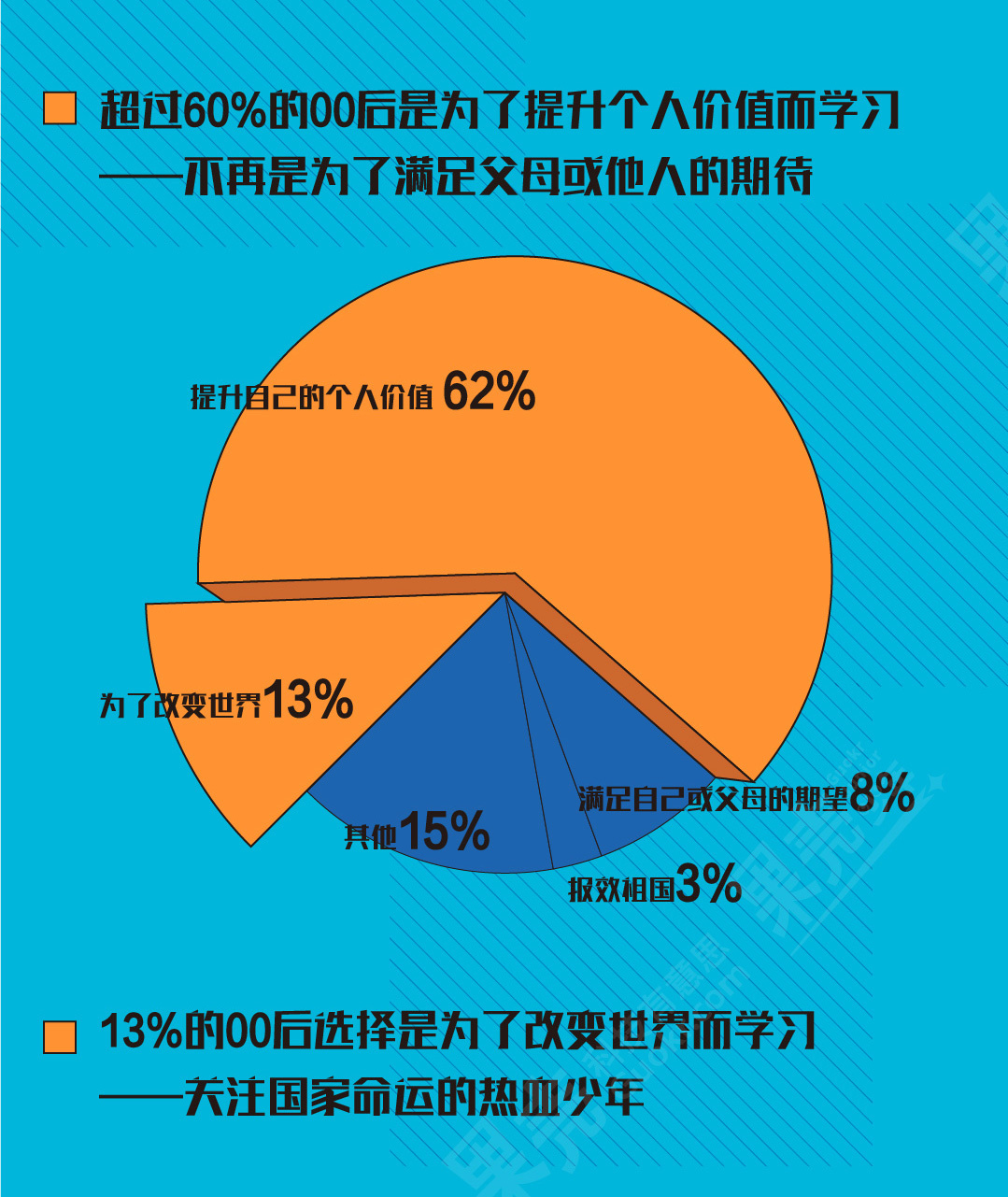 面对学习压力,超过60%的00后从兴趣出发,愿意为提升自我而努力,不再单一地满足父母或其他人的期待;有13%的00后希望通过深度学习改变世界,拥有远大志向。