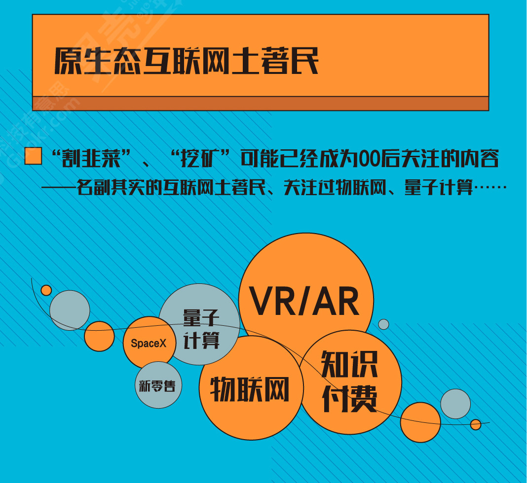 作为互联网原住民,85%以上的00后都使用过线上支付,并将其作为自己喜爱的支付模式;84%的00后对VR、AR技术都有所了解,对“知识付费、物联网、量子计算机、区块链”等时下热词并不陌生;相比俄罗斯世界杯、《创造101》,他们更关注中美贸 易战、朝 鲜放弃核试验;小小年纪的他们甚至可能已经开始失眠脱发。