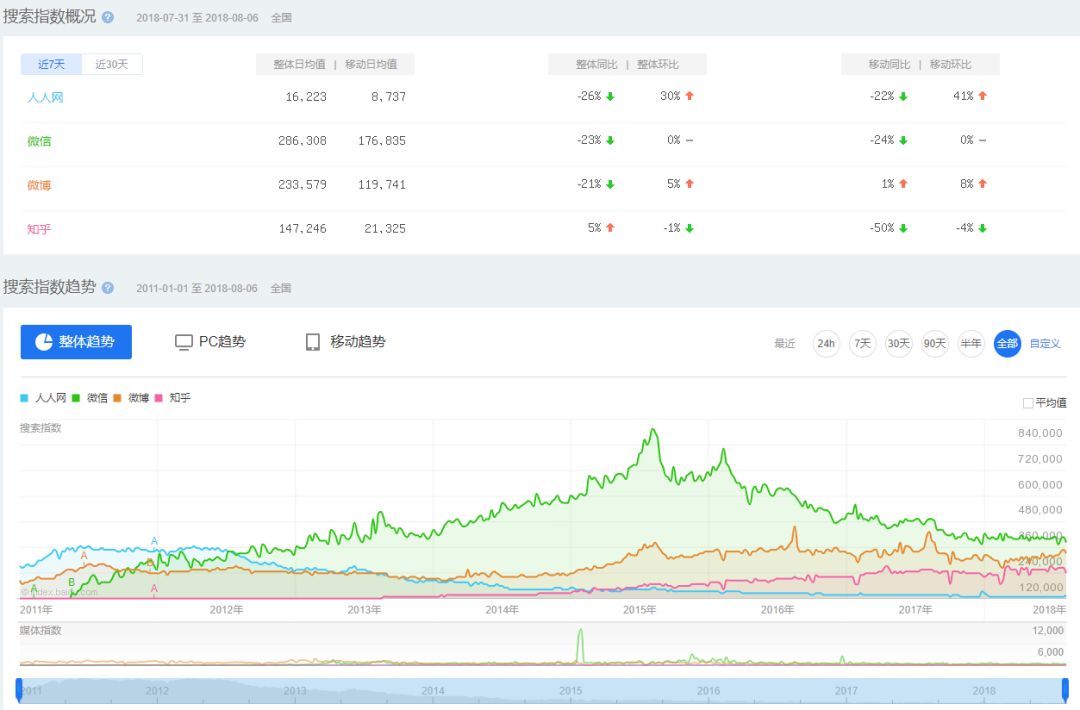 人人网的百度搜索指数变化:2012、2013 和 2015,人人网分别和微信、微博\知乎有过短暂交汇,随后渐行渐远