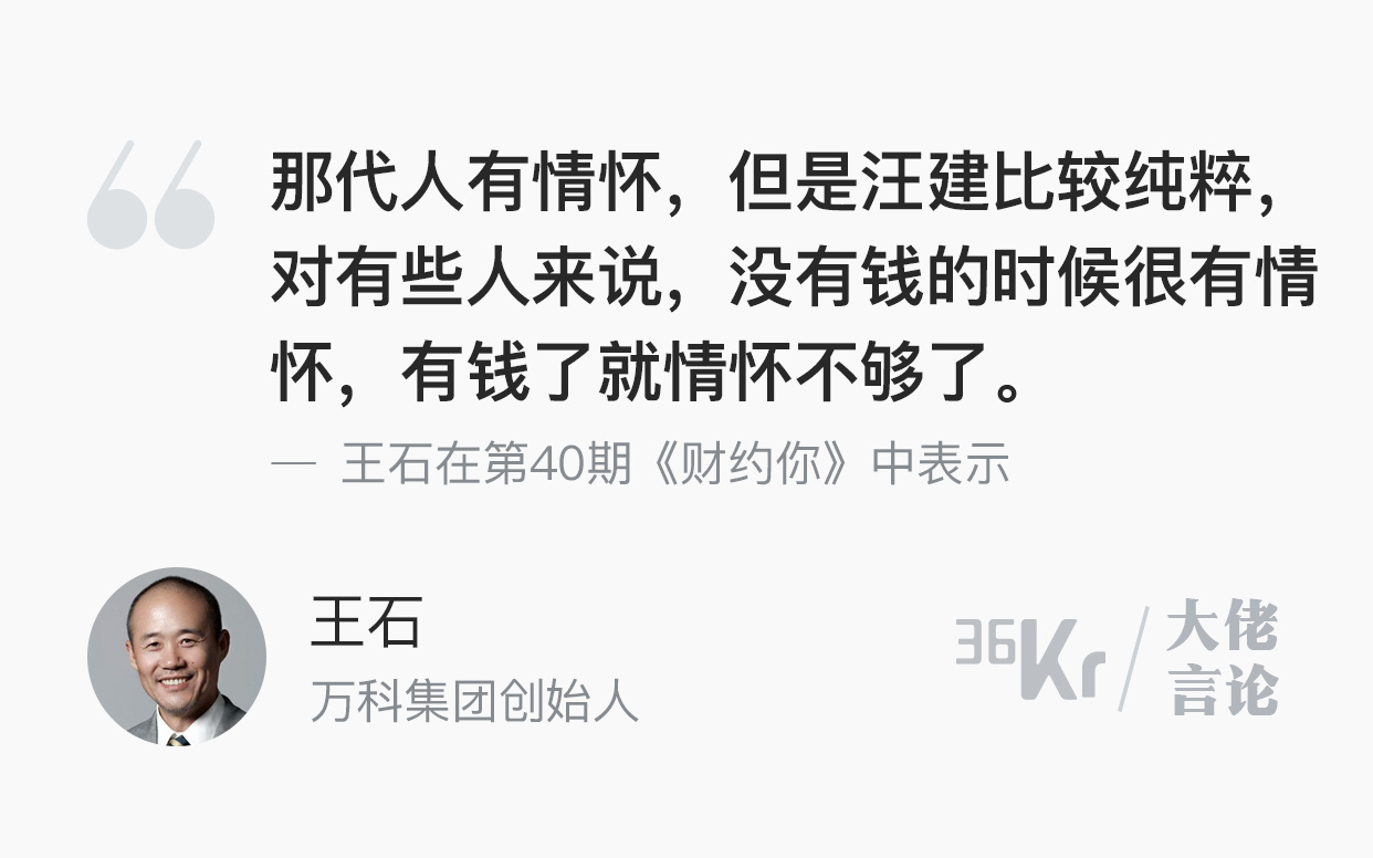 在腾讯视频即将上线的第40期《财约你》中,王石谈到了汪建。