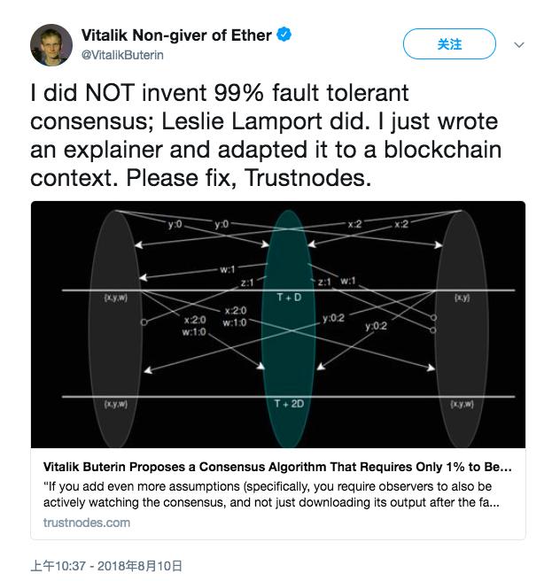 文章发出后,有外国媒体发文称 99% 容错共识是由 V 神提出来的,V 神就此事发 Twitter 澄清,并要求该媒体进行修正: