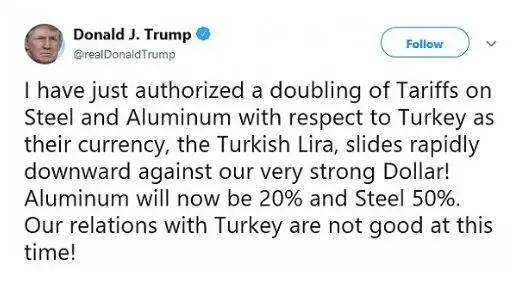 特朗普的推文,是土耳其里拉再次暴跌的直接导火索。