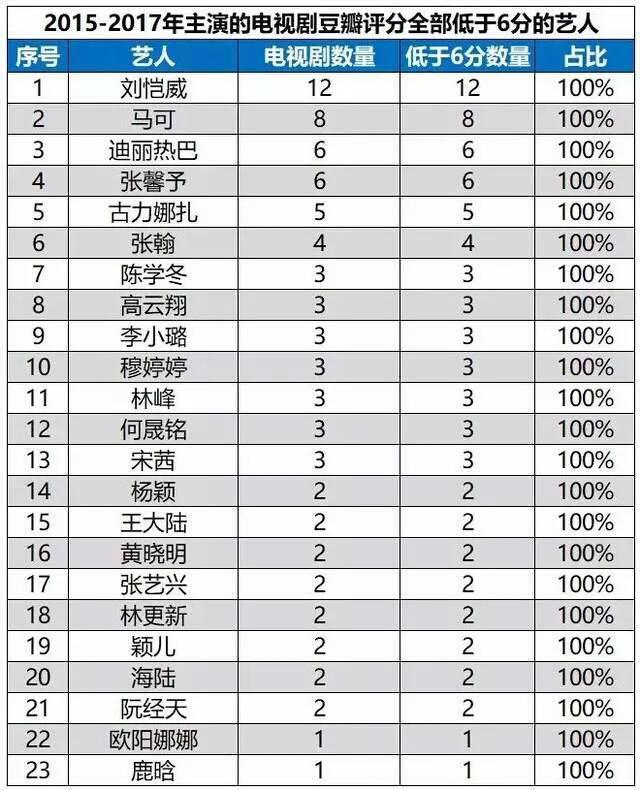 娱乐数据平台Vlinkage总结了2015-2017年烂剧率100%的演员,其中就包括迪丽热巴、张艺兴等等多位流量明星。探讨作品内容时,流量明星甚至已成为贬义词,成为质量低下的代名词。