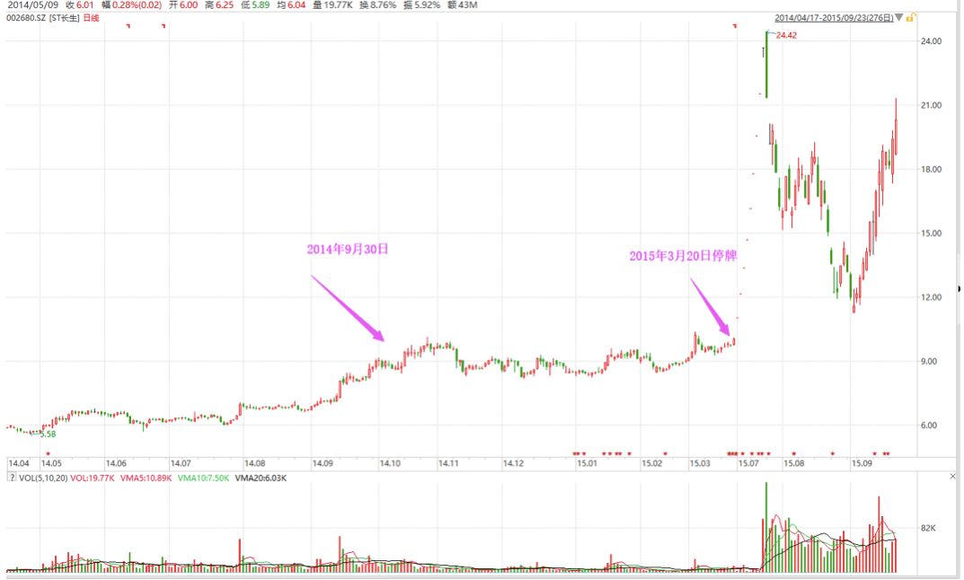 同样的方式再来一次,2015年3月20日,长生生物停牌重组,7月复牌后,连拉9个涨停板,股价飙涨136%。比照之前的精华制药,操作手法极为相似。
