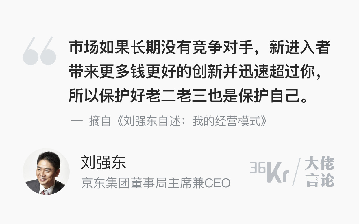 一方面,没有长期没有竞争对手容易使企业懈怠,另一方面,“新进入者可能带来更多钱,带来更好的创新,在各方面的运营参数都会跟你形成竞争并迅速超过你,所以保护好老二老三也是保护自己。”