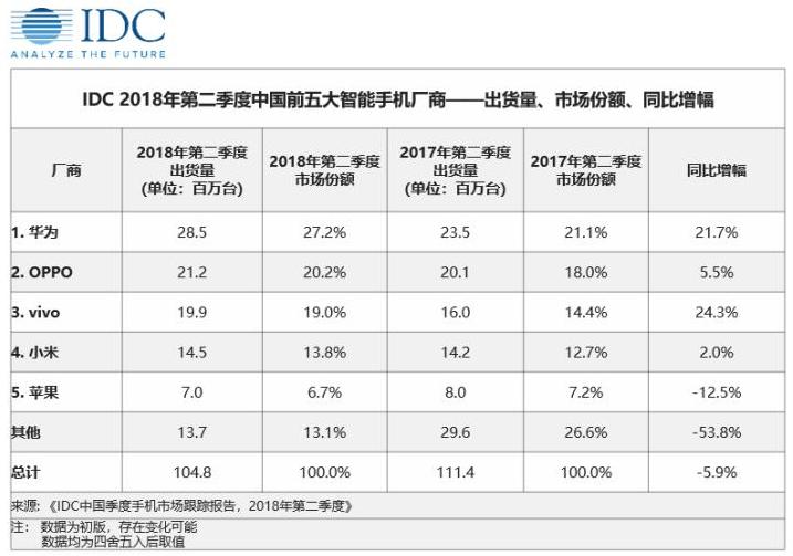 据互联网内容提供商(IDC)和市场研究公司Counterpoint报告显示,在今年第二季度中国智能手机市场占有率中,苹果手机仅排在第五名,以6.7%的市场份额位列本土玩家(华为、Vivo、Oppo和小米手机品牌)之后。