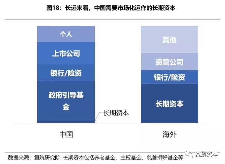 从长期来看,中国资本市场还有很大的发展空间。从二级市场的角度来看,A股目前占中国GDP的70%,远低于美国(145%)或全球(116%)水平。它的健康发展需要:1)引入代表中国发展机会的新经济企业、2)加大机构投资者的配比(例如增加MSCI权重并引入更多海外机构投资者)。从一级市场的角度来说,解决二级市场的问题可以提升行业的匹配度,发挥私募和公开市场的资本协调作用,让更多新经济企业从A股退出。同时策略多元化会提高流动性,让一级市场优胜劣汰,并且健康发展。