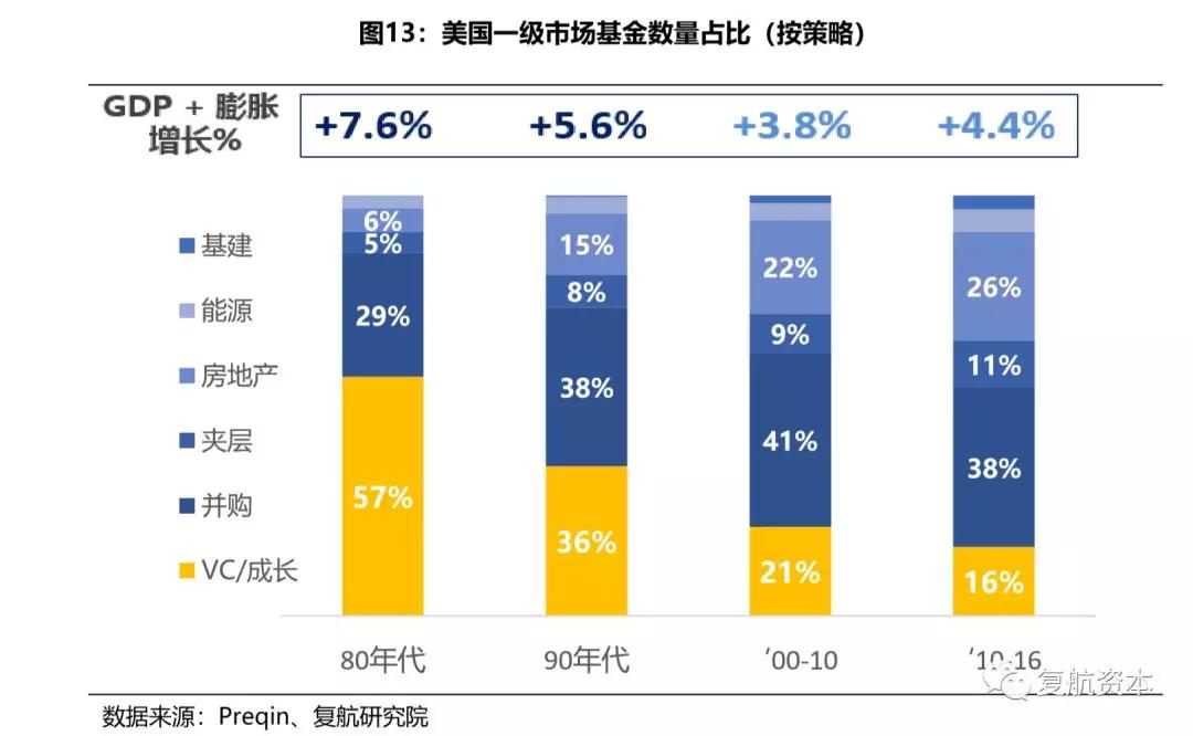 从美国一级市场的发展历程可以看出,随着经济的成熟,VC和成长资本的机会将减少,另类投资策略也将多元化,延伸到房地产和基建领域。市场格局已经变得非常明显: