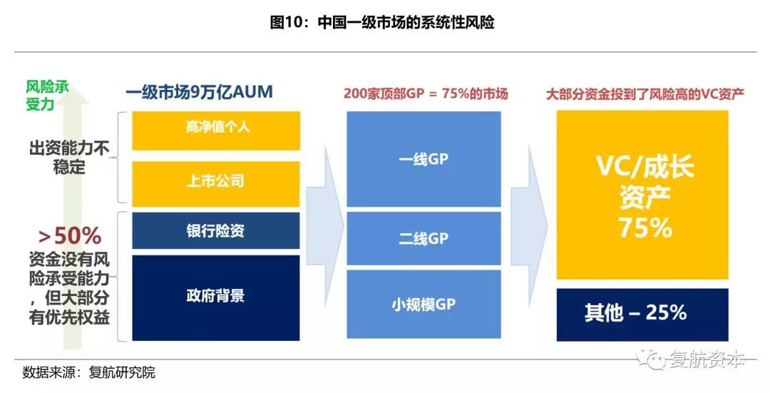 中国一级市场系统性风险来自于,资金端和资产端的风险偏好断层:中国一级市场超过50%的资金来自于政府、国企和金融体系,大部分明股实债并有优先分配权,资产端却投资了75%的VC/成长企业。这种投资周期长,但资金端的要求却非常苛刻。