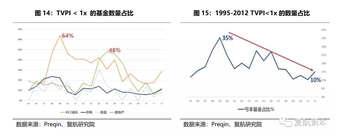 过于集中的投资策略容易引发资产泡沫,泡沫的破裂使得相应的投资策略失效。在重复洗牌的筛选下,资产和GP优胜劣汰。同时,随着投资策略的多元化,美国一级市场的抗风险的能力也逐渐加强:虽然次贷危机影响更大,未回本基金的占比却没有互联网泡沫时的高。