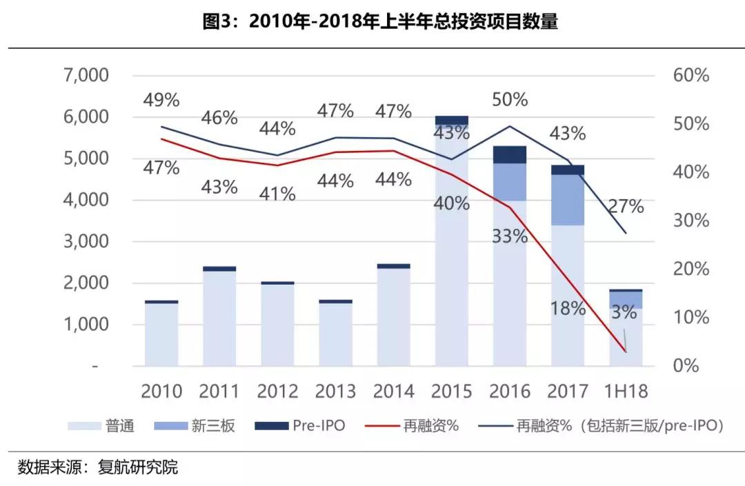 马太效应同样体现在项目再融资上。由于15-17年投资的扩张,更多企业嗷嗷待哺,但相应的再融资比例开始下降。通过对历史数据进行测算,如果一个项目在第二年没有进行再融资,其无法退出或失败的机率高达70%。根据当前一级市场低迷的募资情况,我们预计15-17年项目再融资的比例并不会回到2014年前的水平。