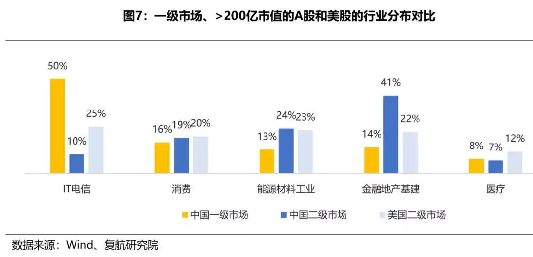 从2017年数据分析,一级市场泛科技类公司投资金额占比超过市场总额的50%。然而,A股市值却主要集中在金融、地产和基建等传统行业,以国企为主。科技股占比低,在市值超过200亿的A股公司占比只有10%。美国二级市场科技股占比相对较高,达到了25%。一、二级市场由于行业分布断层严重,进而使得资本兼并和并购协同性降低。较高的上市门槛和较大的行业差异造成了大部分一级市场资产不得不从海外退出。