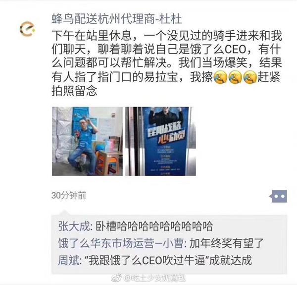 微博网友“学画的疯子”发文称,“刚才给我送水果的小哥自称是饿了么CEO,我说我还是马云呢。结果老公搜了一下,发现真的是饿了么CEO。”