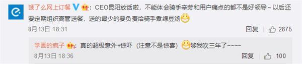 原来,王磊亲自送外卖是为了体会骑手辛劳和用户痛点,表示以后还要定期组织高管送餐,送的最少的要负责给骑手煮绿豆汤。