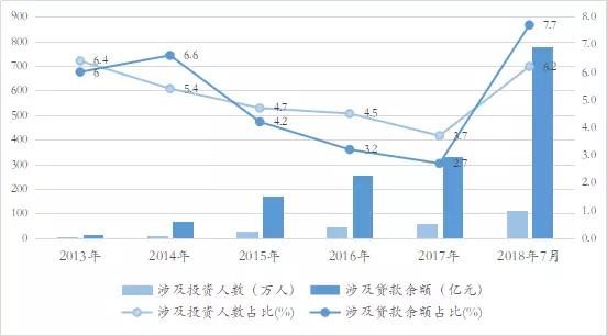 中国式P2P的黄金时代已经结束,随着金融去杠杆推进、融资环境恶化和金融监管升级,一场迟到的出清已经到来。截至2018年7月底,现存正常运营的P2P平台仅有1645家,而出现问题平台就有4740家,占比高达74%,“爆雷”事件频发,尤其是今年以来,出现了超过700多家停业及问题平台,涉及投资人数占比从3.7%上升至6.2%,涉及贷款余额占比从2.7%增至7.7%, P2P行业违约风险加速蔓延,导致P2P投资者恐慌不已,市场信心降至冰点。