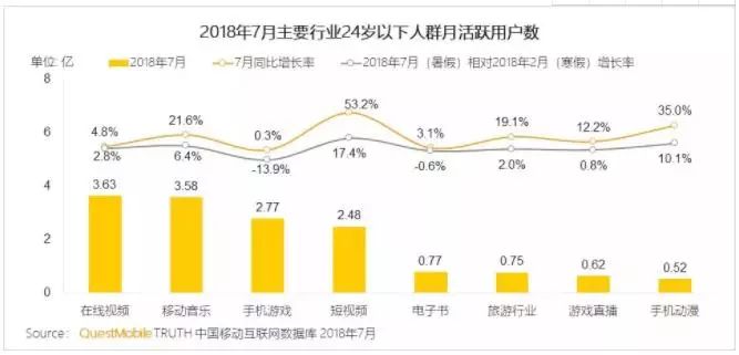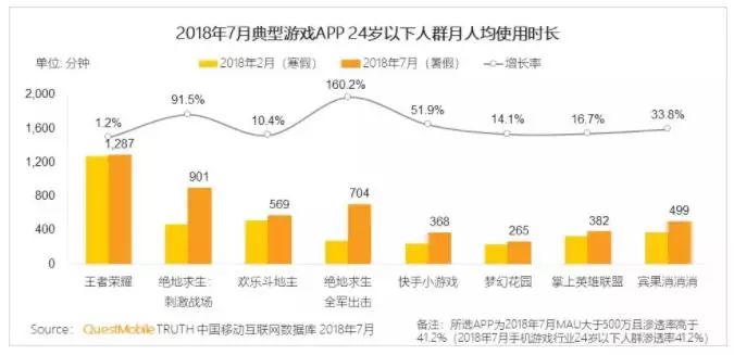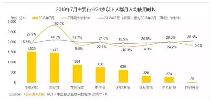 但上半年吃鸡游戏和短视频发展迅猛,深度用户持续增加,带动了行业人均使用时长的快速增长,在泛娱乐相关行业上的时间增幅均超15%,其中手游成为24岁以下人群月人均使用时长最多的项目,高达1525分钟,比寒假增长了18.8%。
