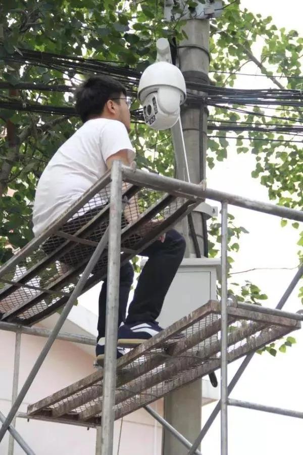 葛宇路也曾搭过一个架子,然后爬到监控摄像头前,和它面面相觑。