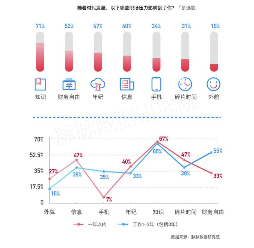 脉脉数据研究院的调研显示,在当今各种五花八门的压力中,知识压力排名第一。“知识落伍”成为各个年龄各个职场阶段人群普遍的担忧。因此也就不难理解,为什么当下社会中各式各样的知识付费成长培训类产品会如此流行。在脉脉,吴晓波就推出了两个系列的脉课堂,分别是《职场修炼指南》、《吴晓波的5分钟职场课》,前者主打“自我提升”,后者则意在“唤醒你的商业智慧”。