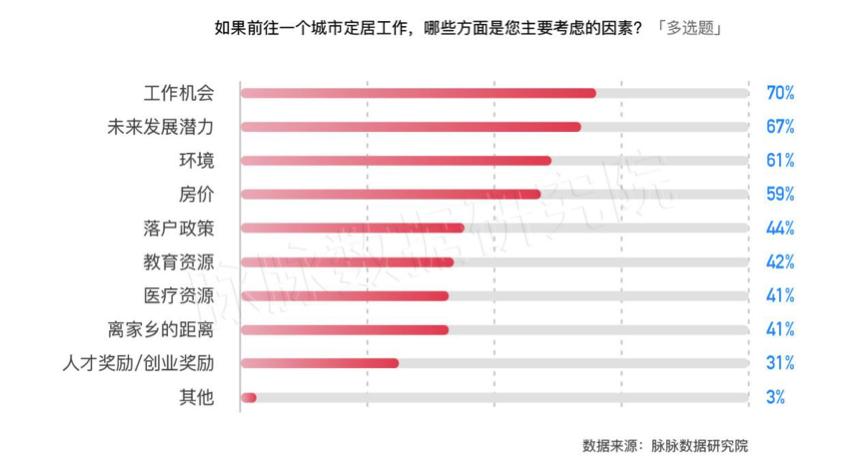 而对于身处北上广深的大多数人来说,抢人政策难以真正激发人才流动欲望,最大的原因是工作与发展机会。调查显示,所在城市的工作机会,成为影响北上广深人才们选择城市的首要考虑因素,紧随其后的因素是城市的发展潜力、城市的环境与城市房价,再往后才是落户政策。