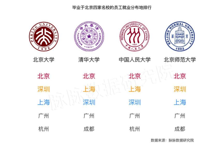 在北京一系列严控人口政策下,正在崛起、落户政策又十分宽松的深圳,成为了许多北京人才除上海之外的又一选择。截至2018年5月的脉脉用户就业所在地数据显示,毕业于北京大学、清华大学、中国人民大学及北京师范大学的职场人,就职于深圳的人数均超过了广州,尤其是对毕业于北京大学与北京师范大学这两所高校的职场人而言,深圳已经成为仅次于北京的第二大就业地。