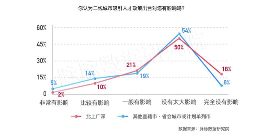 但脉脉数据研究院的调研显示,目前仅有12%的北上广深受访者表示,所谓“抢人大战”对自己非常有影响或者比较有影响,与此同时,在二线城市受访者中的这个比例为19%。显然,相对北上广深这样的一线城市而言,二线城市的“抢人大战”,对二线城市的职场人影响更大。
