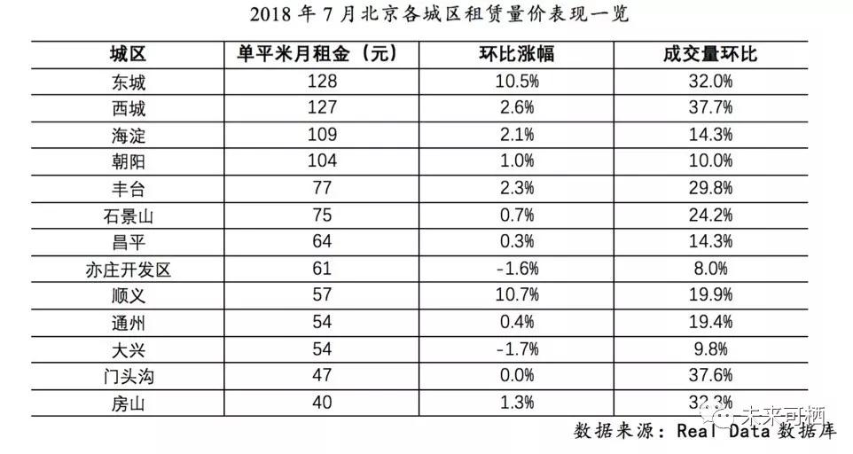 就在李旭找房的同时,贝壳研究院发布了一组数据,2018 年 7 月的北京租赁市场格外「火热」,租赁成交环比增加了 19.2% ,单平米月租金 91.5 元,环比上涨了 2.2 %。东城、西城、丰台、石景山成交量环比涨幅也都超过了 20 %。顺义和东城区租金涨幅最高。租金涨幅排名前三的新奥洋房、三义庙北、城华园的环比涨幅分别达到 36.1 %、28.4 %、24.5 %。